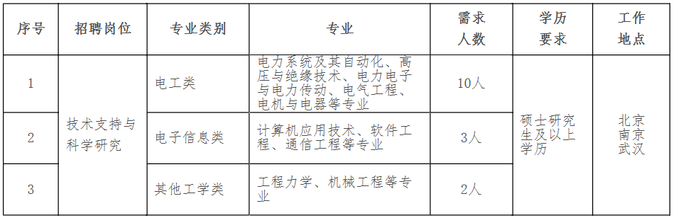 按照用工需求,2017年院本部(工做地正在)聘请电力系统及其从动化、会计学、金融办理、计较机手艺等专业的硕士研究生及以上学历应届结业生。因进京打算需上级单元和国度相关部分审定后方可确定,各岗亭具体需求人数另行发布。