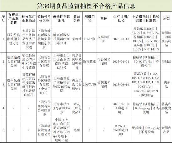 涉及菜籽油、米花 上海这5批次食物抽检不及格